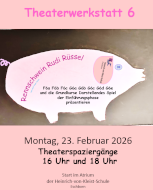 Am Montag, den 23. Februar 2026, präsentieren die Grundkurse Darstellendes Spiel der Einführungsphase gemeinsam mit den Schülerinnen und Schülern der sechsten Klassen Theaterspaziergänge zu ihrer Theaterwerkstatt "Rennschwein Rudi Rüssel".